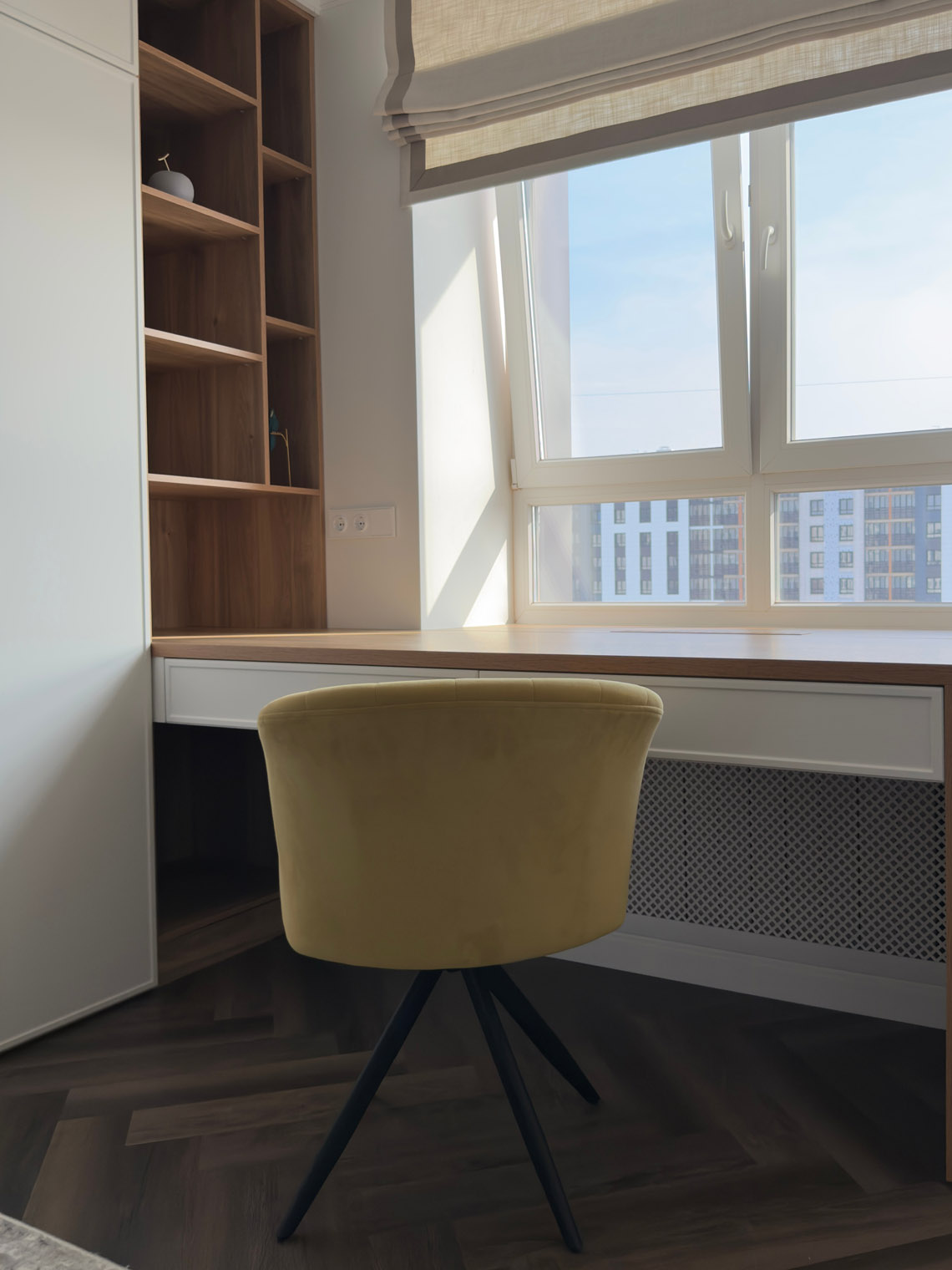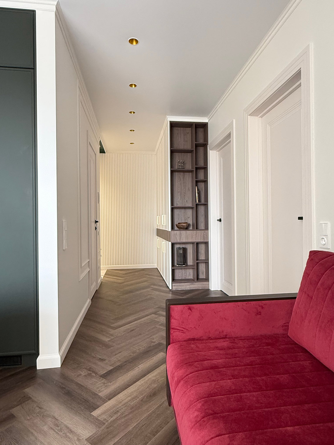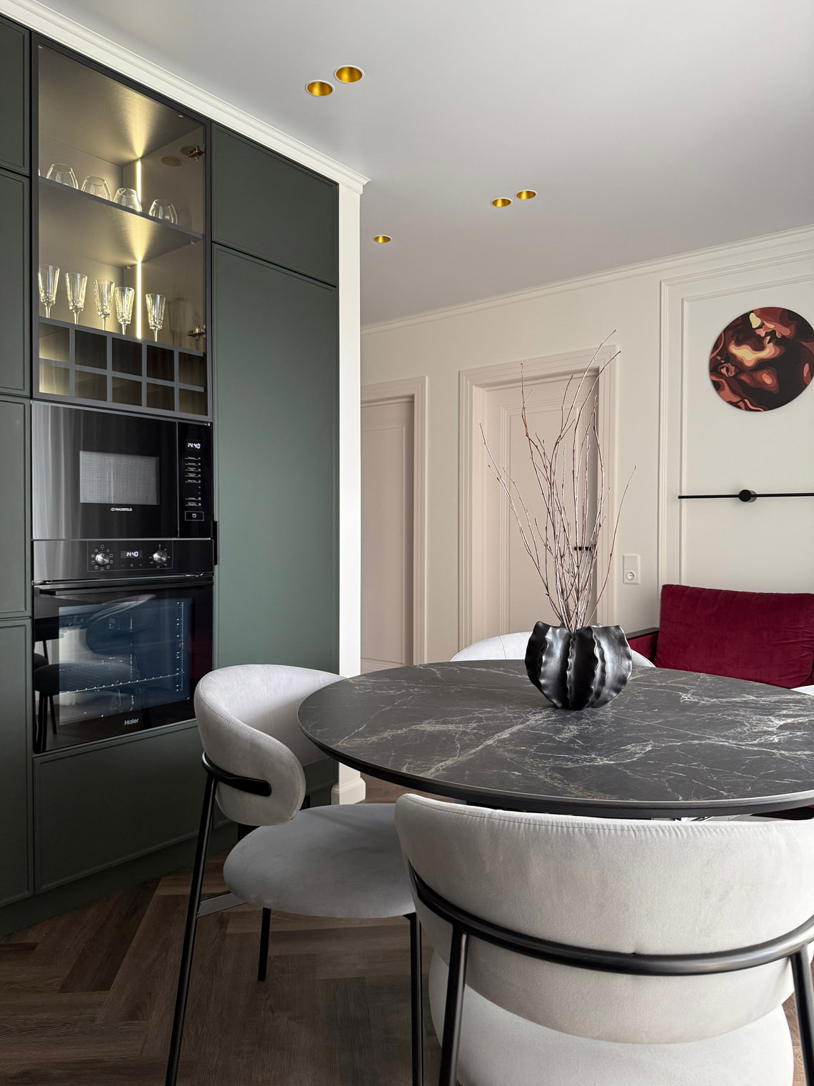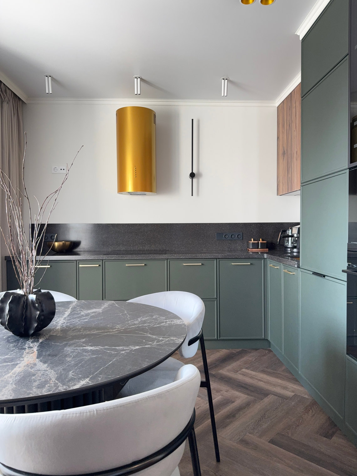 В основе этого интерьера — смелый контраст: белоснежные стены + темная мебель. То, чего многие избегают, здесь выглядит безупречно. Кварцевый ламинат в укладке мелкой «ёлочкой» добавил пространству графичности и поддержал насыщенную цветовую палитру.